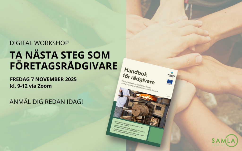 Den 7 november 2025 anordnar SAMLA Sverige/RISE en digital workshop i samarbete med Eldrimner och Jordbruksverket inom ramen för Livsmedelsstrategin 2.0. Varmt välkommen till en förmiddag med praktiska tips och övningar ur boken ”Handbok för rådgivare: Till småskaliga livsmedelsproducenter, mathantverkare och företag inom måltidsturism”. ”Ta nästa steg som företagsrådgivare” är ett webbinar som vi utformat…